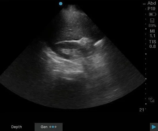This still image shows a sliver of free fluid within the hepatorenal space and potentially some free fluid near the liver edge. Dr. Aiad had the answer quickly: concern for a ruptured ectopic pregnancy.