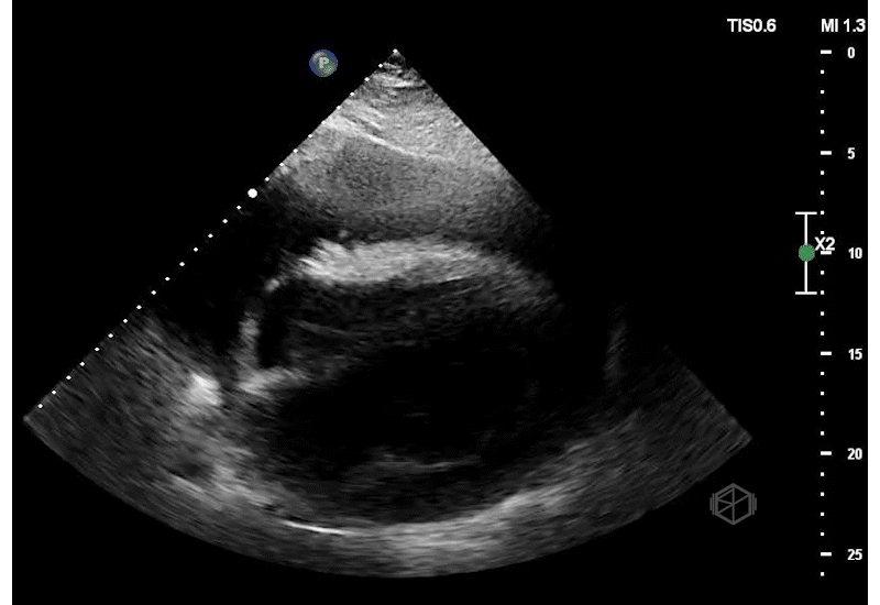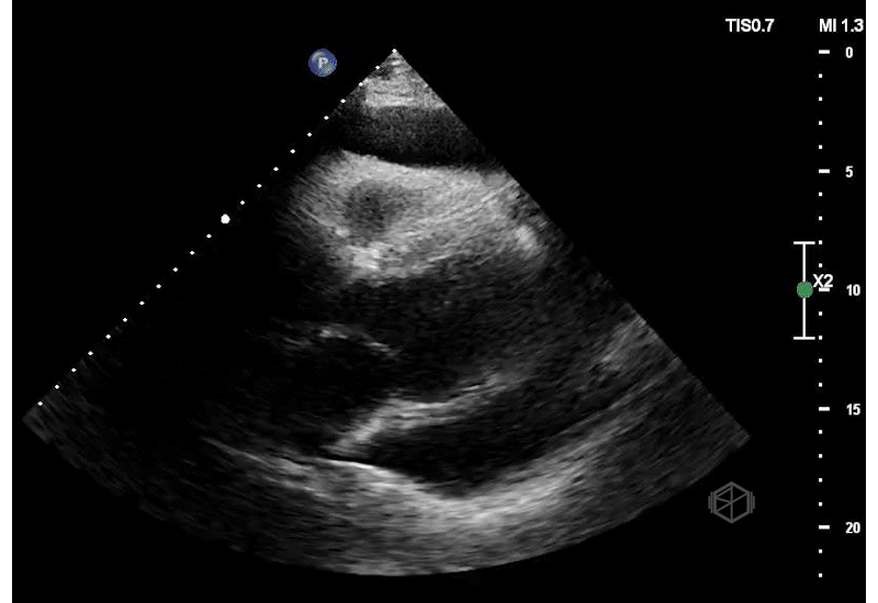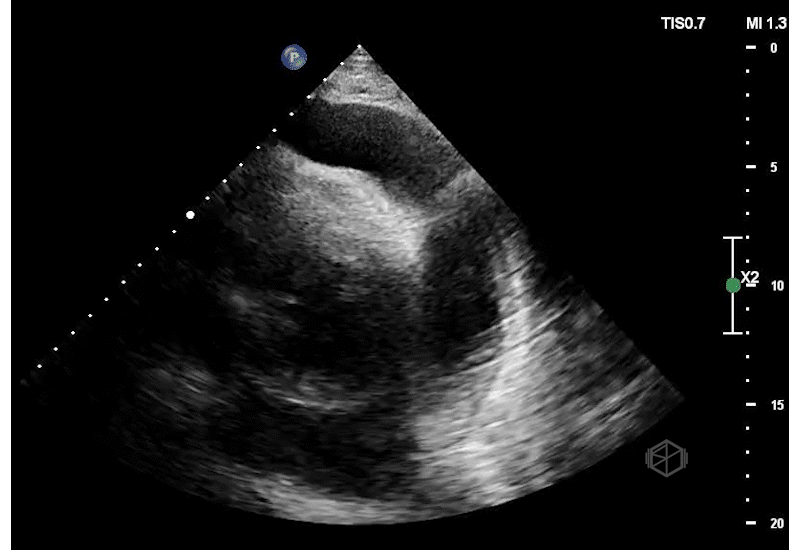 This is a massive pericardial effusion, measuring up to 5.0cm in it’s largest portion. There are signs of tamponade on this echo — aside from the obvious “swinging heart,” there is right ventricular diastolic collapse. The right ventricle does not get a chance to fully fill during diastole due to the extra-cardiac pressure from the pericardial effusion.