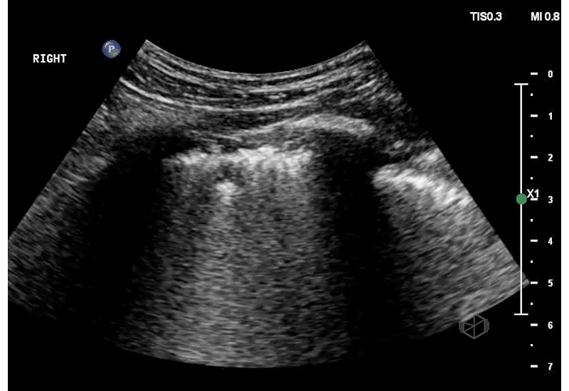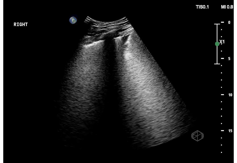 They had a 77-year-old male presenting to the ED complaining of shortness of breath. The patient had a history of CHF and multiple episodes of pneumonia. He was tachypneic, tachycardic, and hypoxic. The team did a POCUS of the lungs and saw the following.