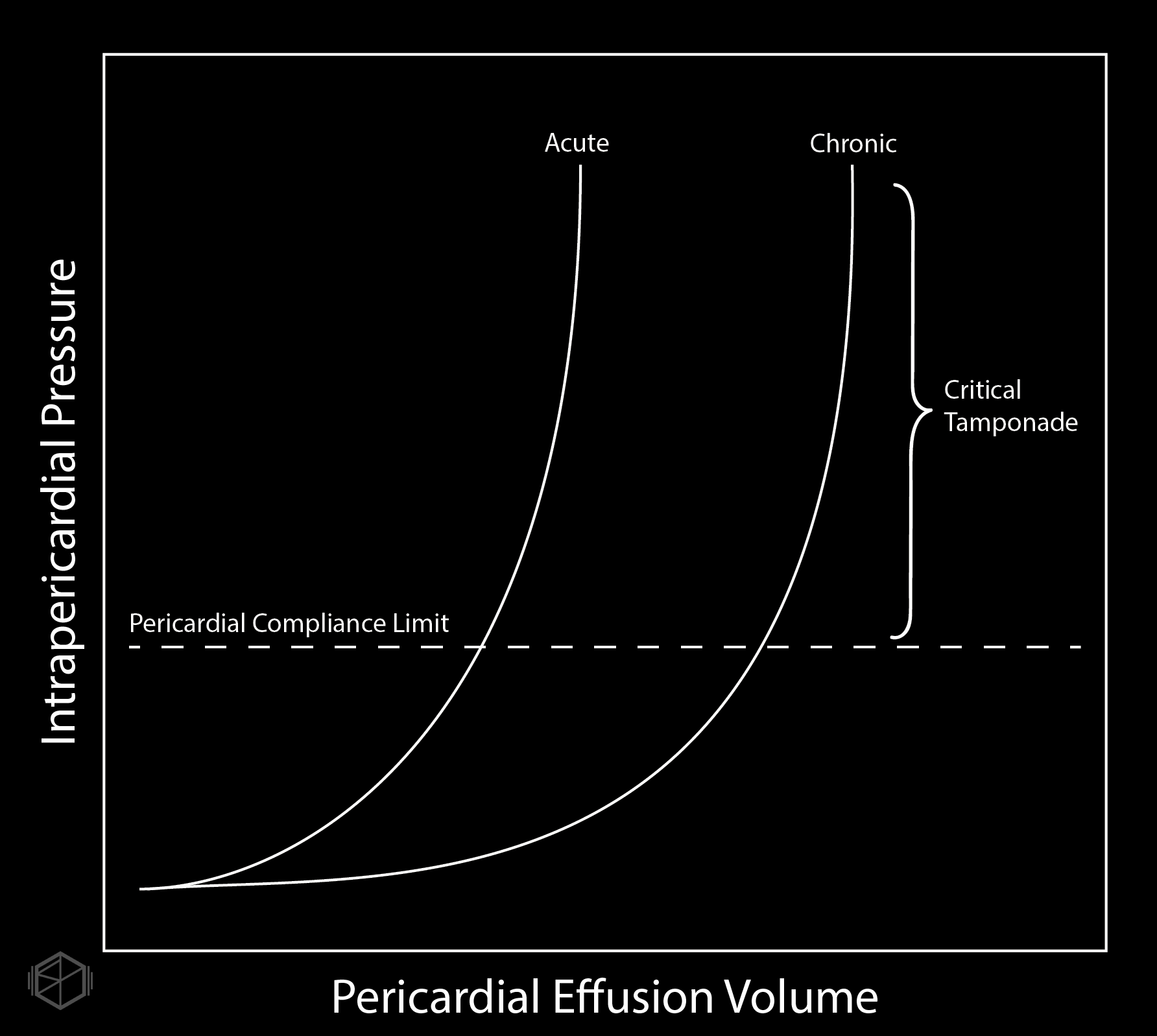 The acuity of pericardial fluid accumulation matters more than the size of the fluid. Large pericardial effusions can be tolerated if gradually developed.