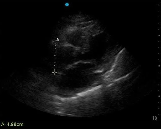 The finding in the second image above is very subtle - it is a still from the first clip above. This highlights the importance of knowing clinically, all the signs and symptoms of the pathology you are looking for as well as the ultrasonographic characteristics. The dilated aortic root alone should give you a hint.